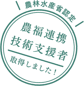 農福連携を通して農業と福祉どちらの課題も解決していきたいと考えており、農業者・就労系障害福祉サービス事業所の職業指導員・障害者本人の三者に対して、農福連携を現場で実践する手法を具体的にアドバイスする専門人材の資格「農福連携技術支援者(農林水産省認定)」を取得しました。